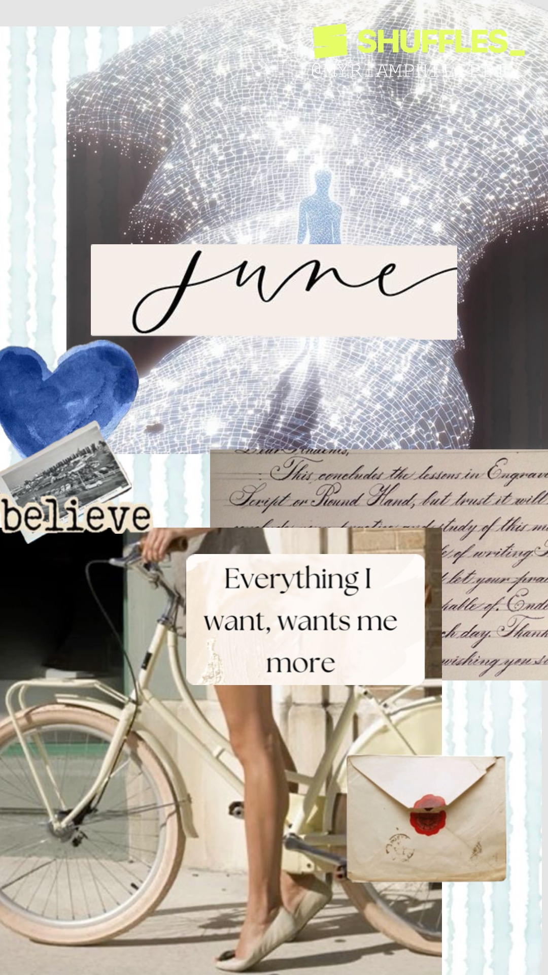 Use images, words, and quotes that capture the vibe you want to live in this month. I use the Shuffles app (free) and set mine as my phone screen! (see below)