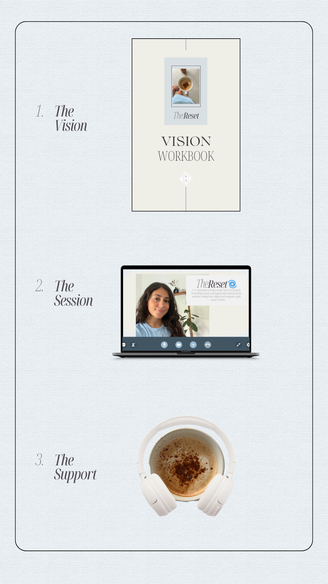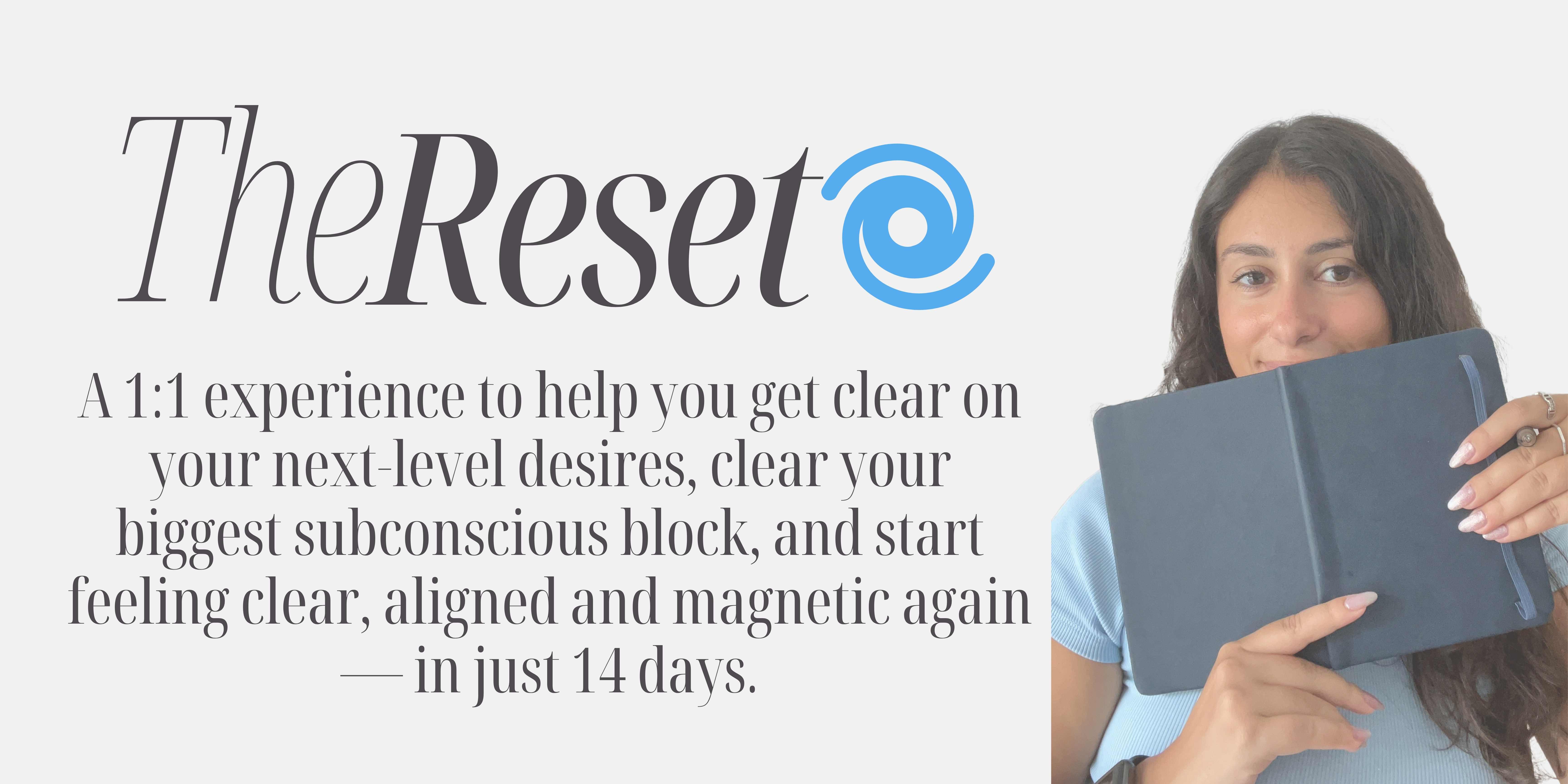The Reset is a 1:1 experience to help you get clear on your next-level desires, uncover and clear your biggest subconscious block, and start feeling inspired, motivated, and magnetic again — in just 14 days.
